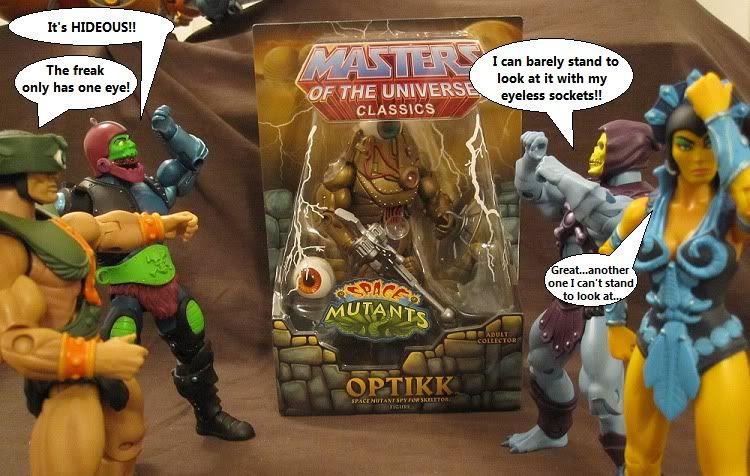 So Optikk is awesome. Not sure if you knew. Heck, you probably didn't even know about him! And why not? Because The New Adventures of He-Man was something that most people hated for some reason, that's why. Optikk came from that very toyline, though the toyline was just called He-Man while the cartoon was The New Adventures of He-man. I didn't have the original figure, but I always wanted him. I mean, what's not to love? Big cyborg eyeball man. Sounds like a score!