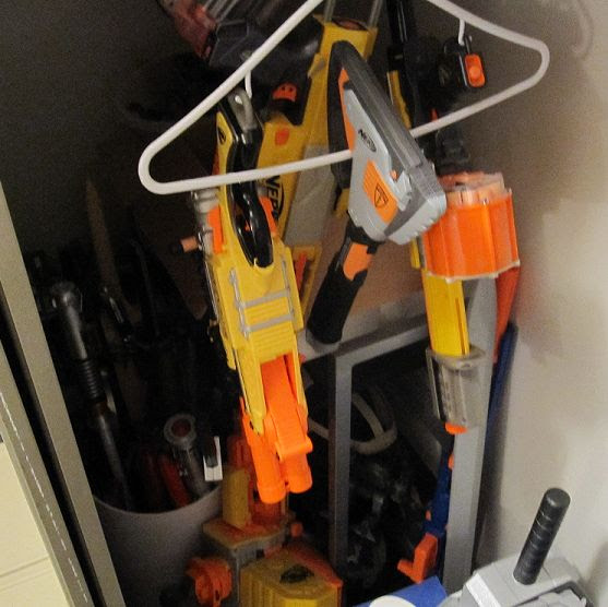 Nerf!  And other weapons.  Plastic weapons.  Heh...yeah, the Nerf may go at one point as well, since they probably have the least use.  I'd like to let loose and shoot some stuff, but I never get around to it (and the last time I went running around in a field with friends it was to play badminton, and that'll probably happen again if we manage to get off our asses.  Badminton's pull is not unlike the powerful gravitational pull of the very life giving Sun itself!).