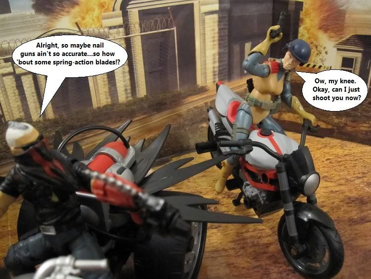So he's not gona be carrying it around, since it's attached to the bike, but I still consider it his standard Dreadnok "destruction weapon." Though, according to the package...it's a "spike blaster." Makes sense, since I guess you don't want kids knowing that nail guns are fun to play with.